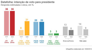 Pesquisa feita pelo Datafolha para o jornal "Folha de S.Paulo" divulgada na edição desta segunda-feira (18) mostra Dilma Rousseff (PT) com 36% das intenções de voto para presidente, seguida de Marina Silva (PSB), com 21%, e Aécio Neves (PSDB), com 20%.