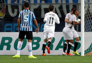 O Santos conquistou uma importante vitória sobre o Grêmio, nesta quinta-feira, em Porto Alegre, pelas oitavas de final da Copa do Brasil. O placar de 2 a 0 sou como uma goleada para os alvinegros, que foram cirúrgicos: passaram a maior parte do tempo presos em seu campo de defesa, sofrendo uma pressão intensa do Tricolor. Nas pouquíssimas chances de gol que tiveram, não desperdiçaram: David Braz abriu o placar; Robinho completou. Ambos no primeiro tempo. Os gremistas reclamaram muito da arbitragem. De fato, o segundo gol santista saiu de uma jogada irregular de Lucas Lima, que ajeitou com o braço antes de arrancar e dar a assistência para Robinho.A marca negativa do jogo: o goleiro Aranha, do Santos, disse ter sido ofendido com xingamentos racistas por torcedores do Tricolor. Imagens da ESPN mostram uma garota com um grupo de rapazes fazendo sons de um macaco.