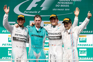 Os pilotos Nico Rosberg e Lewis Hamilton, que brigam pelo título mundial e Felipe Massa, que festejou o terceiro lugar como uma vitória no BrasilCom a vitória, o alemão diminuiu a vantagem de Hamilton na liderança do mundial