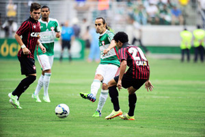 Ufa! O Palmeiras está livre do rebaixamento. Para isso, porém, passou por maus bocados em sua nova arena. Saiu atrás no placar, precisou que o árbitro da linha de fundo visse o toque na mão do zagueiro Dráusio, do Atlético-PR, e só pôde comemorar a permanência na primeira divisão minutos depois do término da partida, empatada em 1 a 1. O grito de alívio veio com o gol de Thiago Ribeiro, do Santos, sobre o Vitória, no Barradão.O Atlético-PR fez boa jogada pela esquerda. Marcos Guilherme fintou Lúcio e bateu. Após a defesa de Fernando Prass e o bate-rebate dentro da área, a bola sobrou para Nathan, que acertou o chute. Gabriel Dias foi preciso. Bem posicionado, o volante evitou o gol do Furacão.