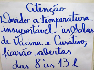 Uma ajudante de despachante aduaneiro de Guarujá, no litoral de São Paulo, flagrou uma situação curiosa em uma Unidade Básica de Saúde (UBS) do município, no fim da tarde desta terça-feira (20). Devido ao calor intenso dentro do local, funcionários colocaram um aviso informando de que as salas de vacina e curativo só permaneceriam abertas até às 13h, apesar de a UBS funcionar até as 17h.