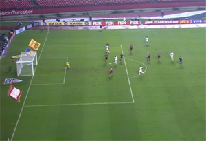 Já aos 16, Anderson Pico salvou o Flamengo de forma espetacular. Luis Fabiano finalizou duas vezes, primeiro Paulo Victor defendeu, e, na segunda tentativa, o lateral-esquerdo tirou, de carrinho e no contrapé, em cima da linha.