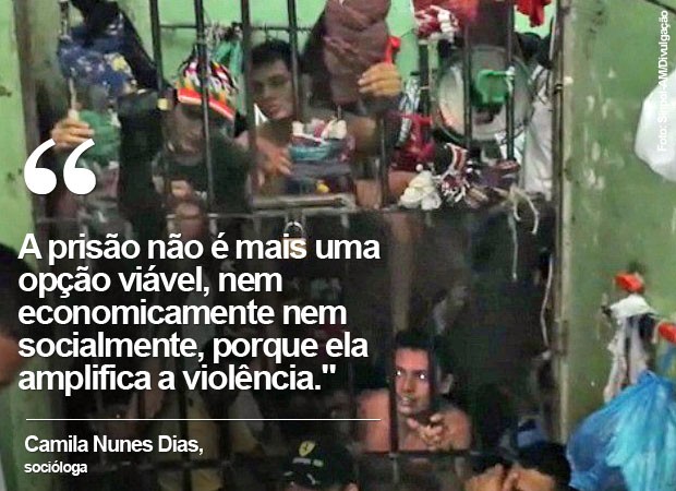 “As prisões têm se deteriorado pelo próprio processo de encarceramento. Com a ampliação do número de presos, o estado é incapaz de acompanhar esse aumento, em termos de expansão das vagas, e há automaticamente uma deterioração das condições das prisões, tanto física como moral. O espaço hoje é desumano, a comida é um horror. Há uma piora na qualidade de todos os serviços e deficiência na assistência jurídica, social, médica”, afirma Camila Nunes Dias.