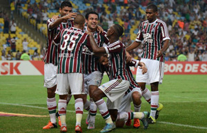 Jogadores do Fluminense comemoram um dos gols na vitória sobre o São Paulo (Foto: André Durão)