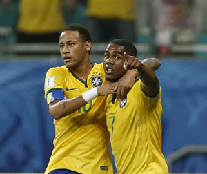 Douglas Costa e Neymar comemoram gol da seleção sobre o Peru