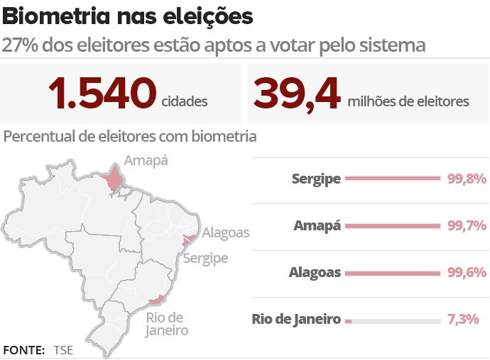 Os estados com o maior número de eleitores com biometria são Sergipe (99,8%), Amapá (99,7%) e Alagoas (99,6%). Rio de Janeiro é o que terá menos eleitores pelo novo sistema: apenas 7,3%.