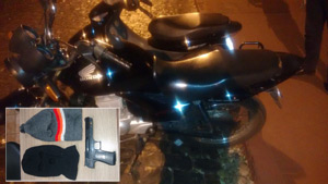 Moto que a dupla tentou roubar. No destaque, réplica de arma e tocas apreendidas com os indivíduos