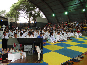 Solenidade de troca de faixas; no destaque, o atleta Branco Zanol junto à mesa de autoridades