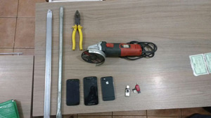 Os policiais vistoriaram o interior do carro e encontraram diversas ferramentas utilizadas para arrombar caixas eletrônicos. A PM também constatou que o lacre da placa estava violado. Em contato com a região, ainda verificaram que um dos indivíduos possuía várias passagens pela polícia por tráfico de drogas e o outro por roubos.