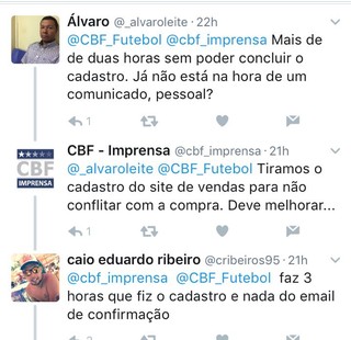 A maioria das queixas nas redes sociais diz respeito ao cadastro que precisa ser feito para realizar a compra. Algumas pessoas não conseguem concluí-lo, segundo as reclamações. Em relação a esse problema, a CBF garante já ter resolvido.