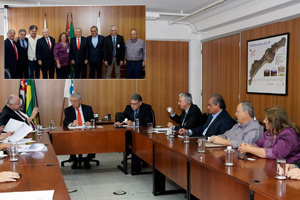 A prefeita Adriana Quireza Jacob Lima Machado, o deputado estadual Barros Munhoz e autoridades na reunião na Secretaria de Saneamento e Recursos Hídricos do Estado de São Paulo; no destaque, autoridades Poço artesiano contribuirá para a captação e abastecimento de água naquele setor da cidade